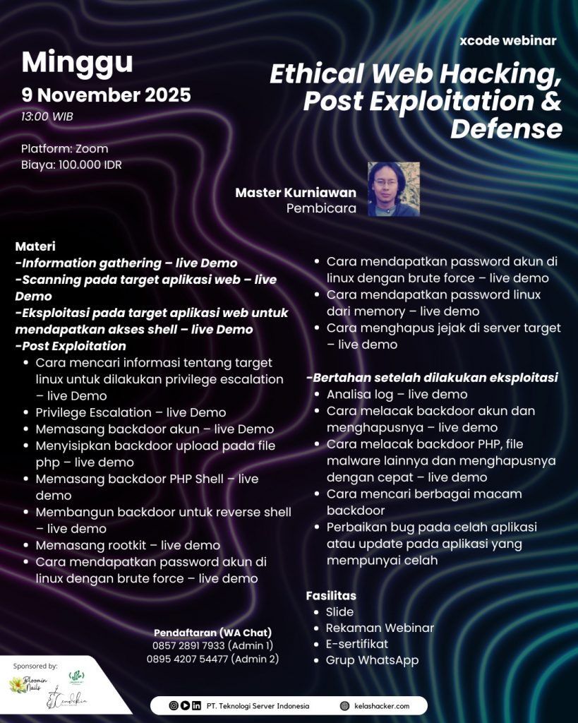 Webinar X-code : Ethical Web Hacking, Post Exploitation & Defense | Minggu, 9 November 2025, pukul 13:00 WIB