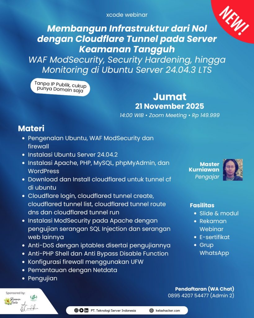 BARU Webinar X-Code : Membangun Infrastruktur dari Nol dengan Cloudflare Tunnel pada Server Keamanan Tangguh — WAF ModSecurity, Security Hardening, hingga Monitoring di Ubuntu Server 24.04.3 LTS (Tanpa perlu IP Publik, cukup punya Domain saja)