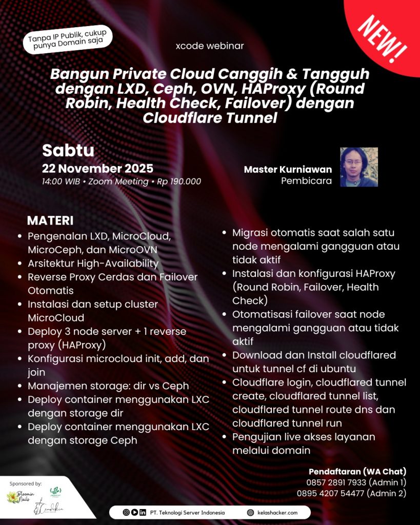Webinar X-Code : Bangun Private Cloud Canggih & Tangguh dengan LXD, Ceph, OVN, HAProxy (Round Robin, Health Check, Failover) dengan Cloudflare Tunnel | Sabtu, 22 November 2025 pukul 14.00 WIB
