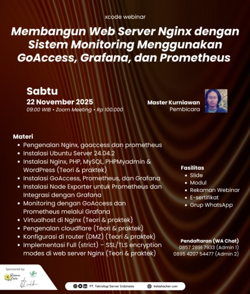 Webinar X-code: Membangun Web Server Nginx dengan Sistem Monitoring Menggunakan GoAccess, Grafana, dan Prometheus | Sabtu, 22 November 2025 pukul 09.00 WIB