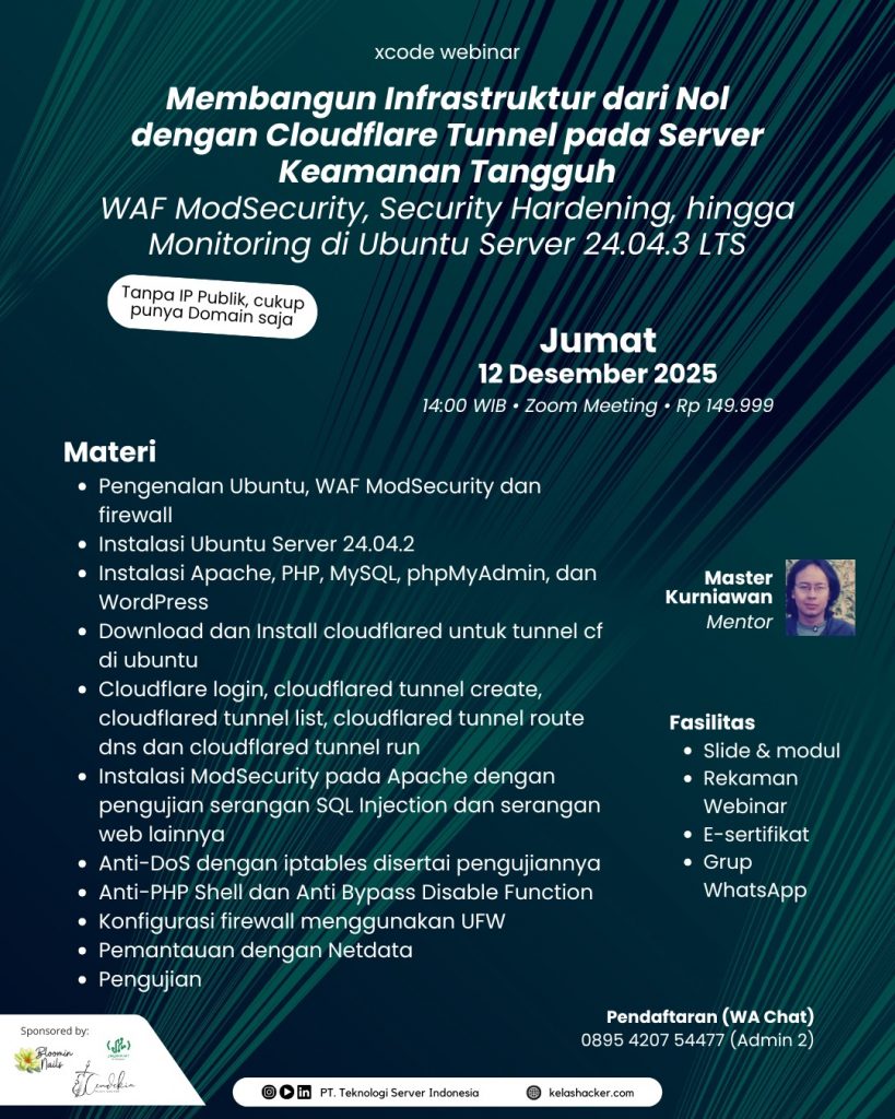 Webinar X-Code : Membangun Infrastruktur dari Nol dengan Cloudflare Tunnel pada Server Keamanan Tangguh — WAF ModSecurity, Security Hardening, hingga Monitoring di Ubuntu Server 24.04.3 LTS | Jumat, 12 Desember 2025 pukul 14.00 WIB