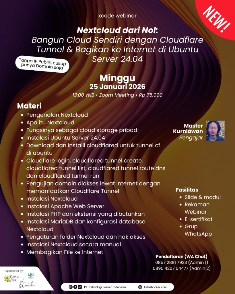Webinar X-Code Nextcloud dari Nol: Bangun Cloud Sendiri dengan Cloudflare Tunnel & Bagikan ke Internet di Ubuntu Server 24.04 (Tanpa perlu IP Publik, cukup punya Domain saja) | Minggu, 25 Januari 2026 pukul 13.00 WIB
